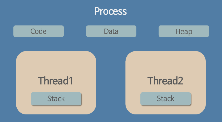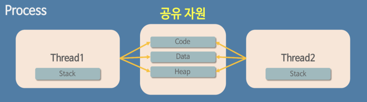 - 프로세스 내에서 stack만 따로 할당받고, code, data, heap 영역은 공유한다.