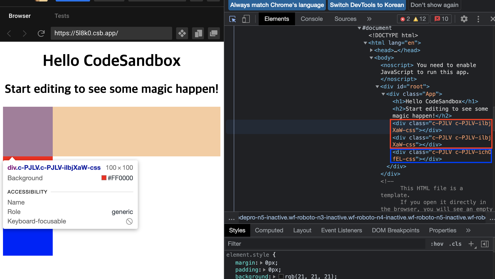 c+cmd+shift를 눌러 inspect 모드로 전환하여 두 빨간 박스를 확인하면 class의 해쉬값이 동일하다.