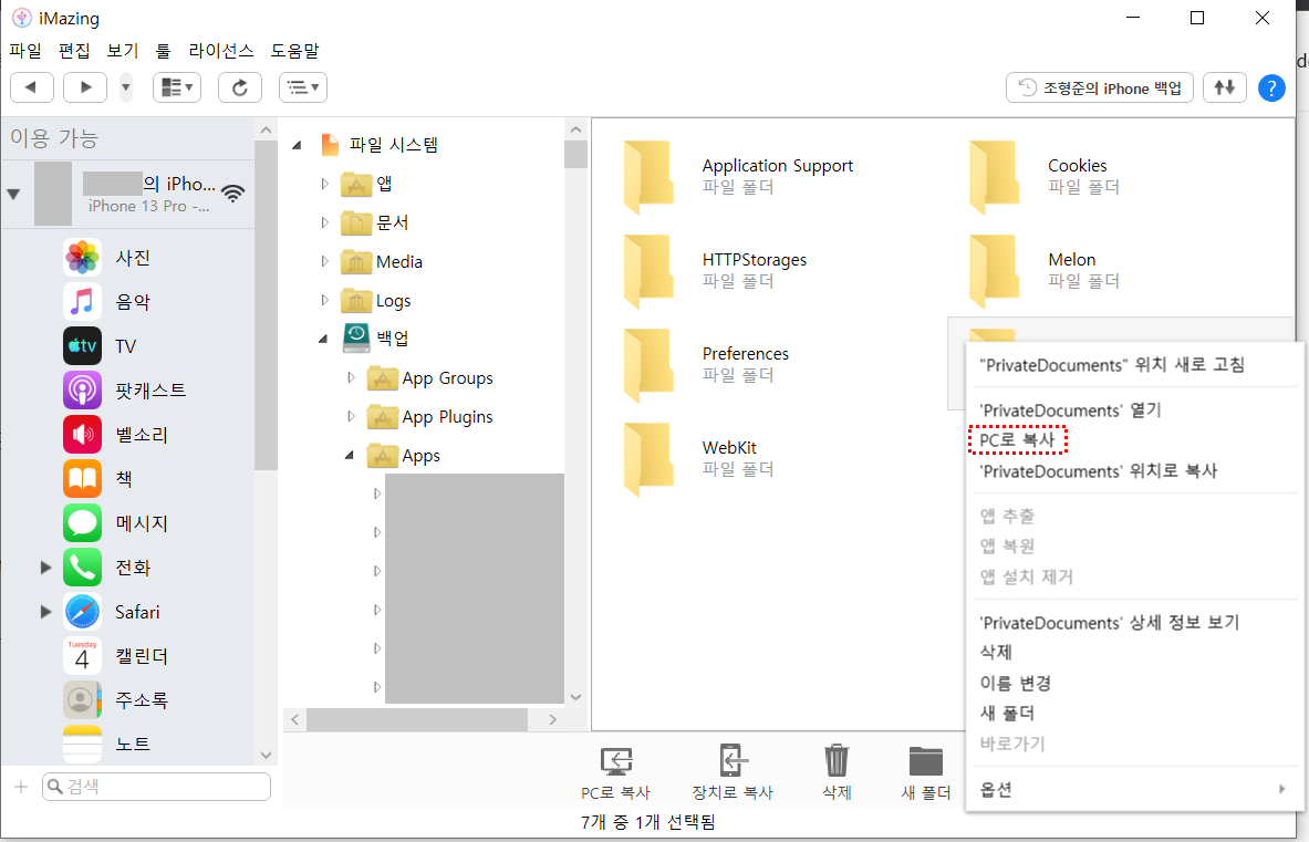 이 백업 사본에 3번 과정에서 pc에 추출해둔 PrivateDocuments를 덮어씌울 것입니다. 백업 사본의 다음 경로로 들어가주세요.