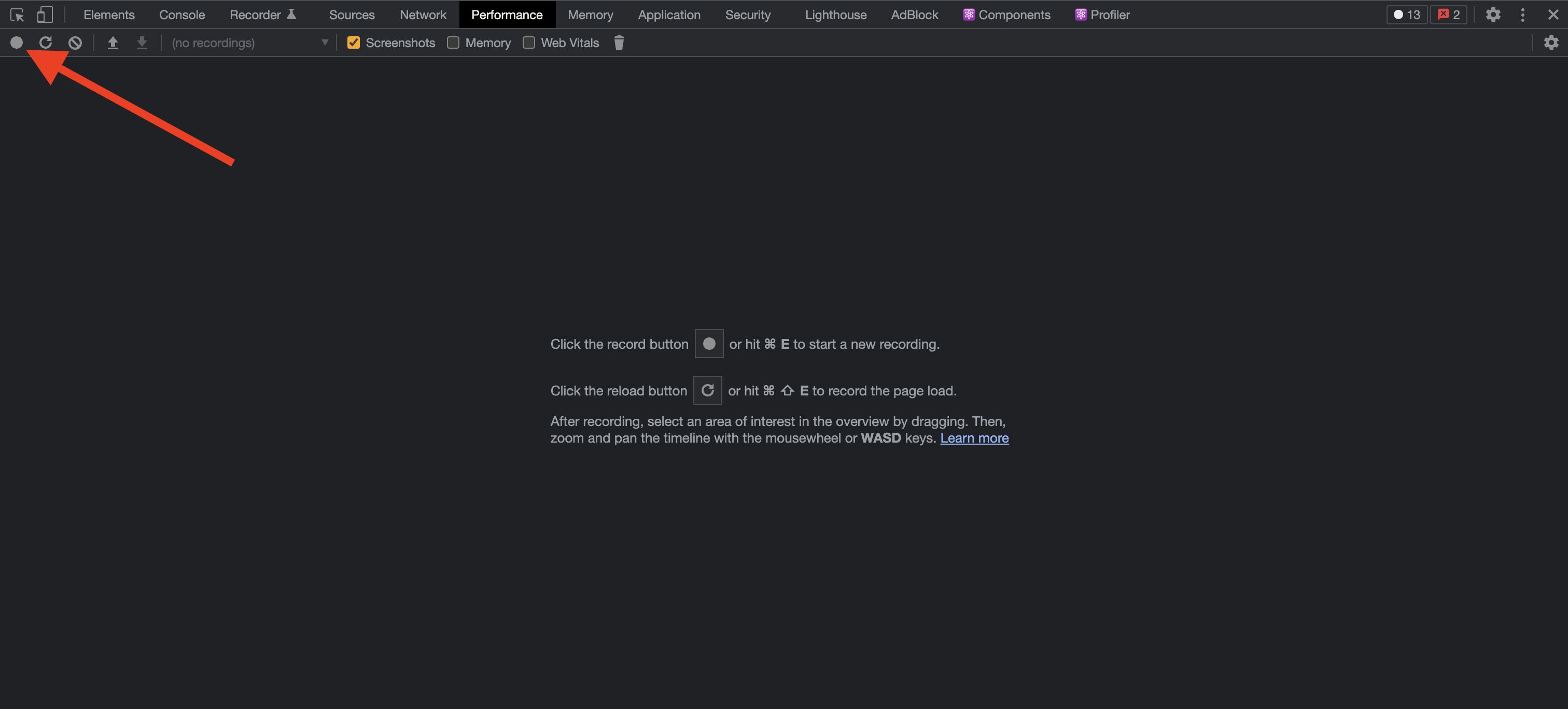 1. 개발자 도구의 Performance 탭에서 좌측 상단의 녹화버튼을 클릭합니다