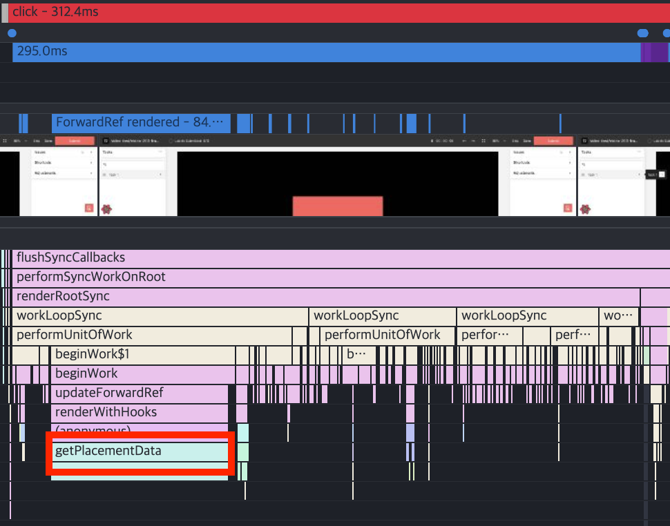 click 이벤트 발생 시, 실행되는 getPlacementData라는 함수의 실행시간이 83.5ms로 꽤나 깁니다.