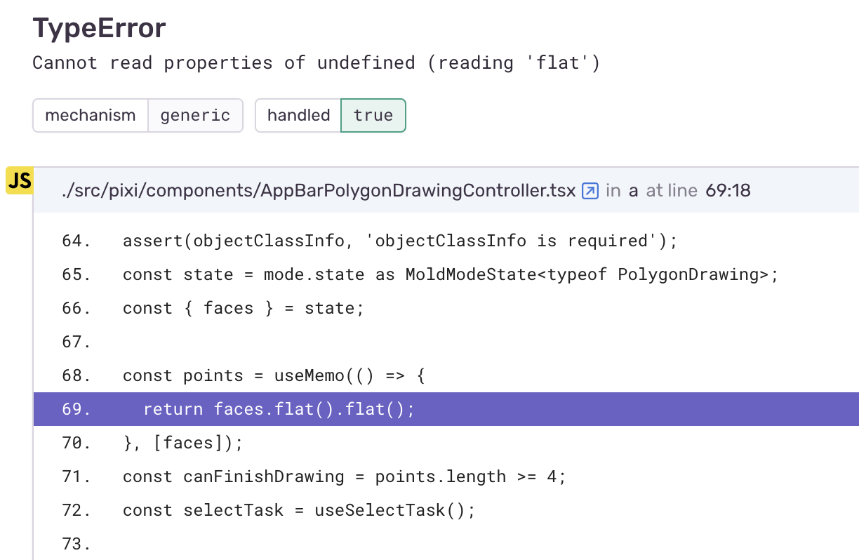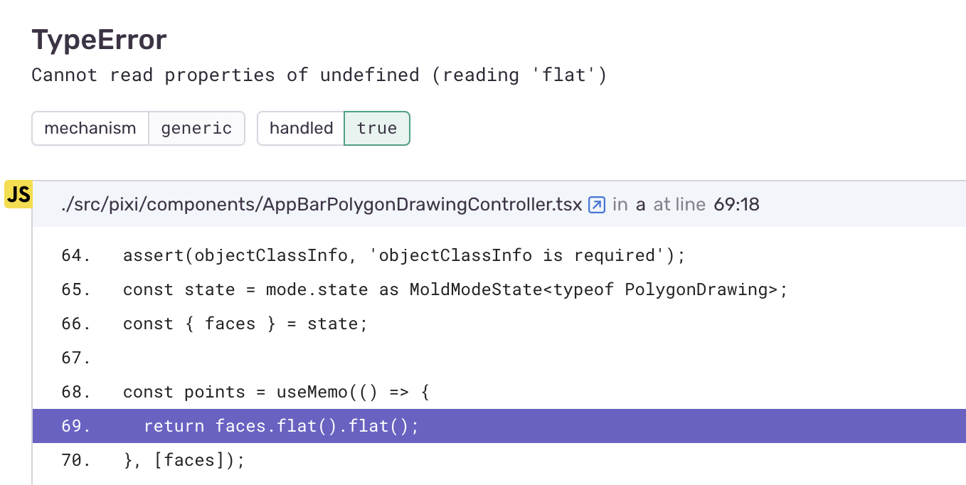 이번에 발견하게 된 버그는 폴리곤 도형을 그리는 역할을 담당하는 PolygonDrawing이라는 컴포넌트를 리팩터링한 이후 발생하였는데요. 이 PolygonDrawing 컴포넌트에는 faces라는, 폴리곤을 그리는 도중의 점들의 좌표의 배열 상태가 존재하는데요. 이 상태가 undefined가 되는 버그가 센트리의 에러 모니터링에서 나타나기 시작했습니다. 도형을 그리는 도중에 faces가 undefined 되는 상황은 상정하지 않았기 때문에 서둘러 살펴보기 시작했습니다.