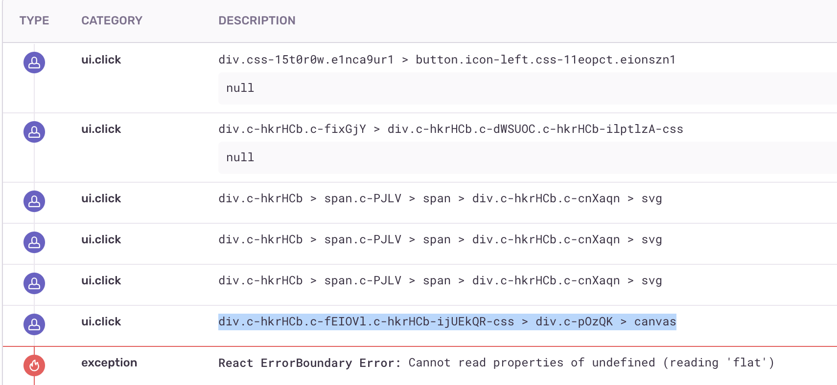 버그가 발생할 당시 이벤트 로그 또한 센트리에서 확인할 수 있는데요. 버그 8건의 이벤트를 확인해 본 결과, canvas, span, textarea 태그를 사용하는 컴포넌트를 클릭한 후, 버그가 발생했음을 확인했습니다. Superb Label의 어노테이션 앱에서 textarea를 사용하는 곳은, 이슈를 생성하는 mode를 담당하는 IssueCreating컴포넌트가 유일하기 때문에 버그 발생 지점을 좁혀볼 수 있었습니다.
