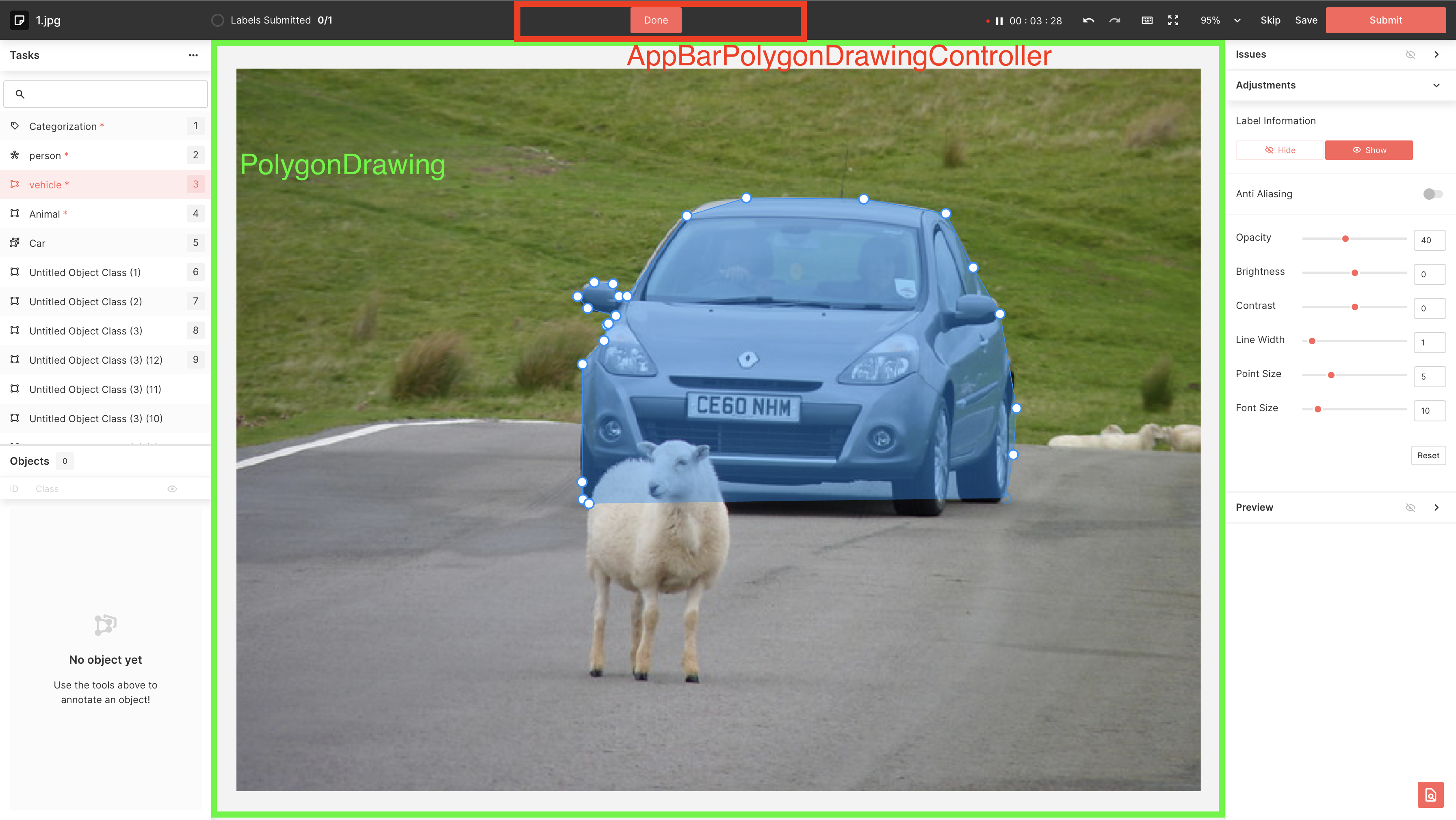 Superb Label에서 폴리곤 도형을 그릴 때, 두 가지 컴포넌트가 렌더링 됩니다. PolygonDrawing과 AppBarPolygonDrawingController인데요. PolygonDrawing은 canvas를 덮는 투명한 div로 만들어진 이벤트 패널을 렌더링하여 마우스 포인터에서 발생하는 이벤트를 수집합니다. 또한 마우스 포인터 입력으로 생성되는 좌표 정보에 따라 점, 선, 면을 렌더링합니다.